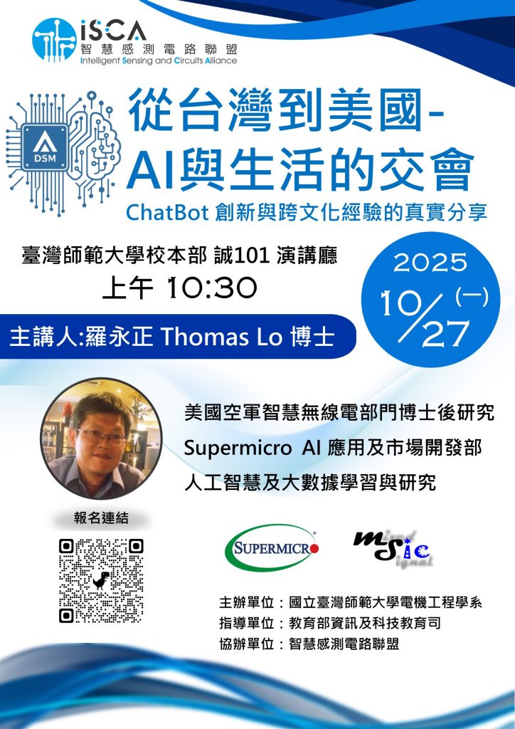 電機系專題演講:從台灣到美國-AI與生活的交會 ChatBot 創新與跨文化經驗的真實分享,講者:羅永正博士,美超微 AI應用及市場開發部門,114/10/27(一)上午10:00,誠101演講廳 Post author:ee Post published:2025-10-23
