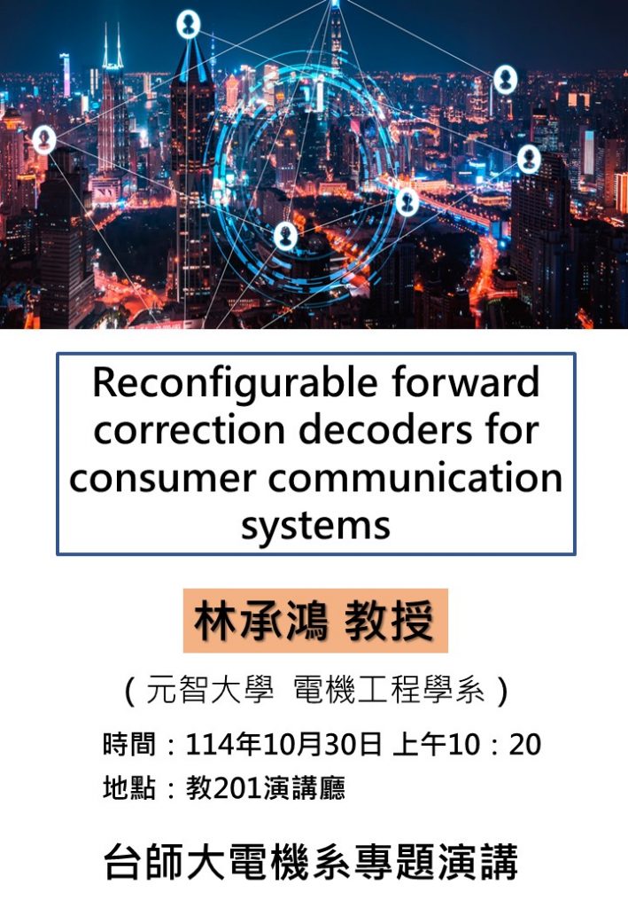 電機系專題演講:Reconfigurable forward correction decoders for consumer communication systems,講者:林承鴻教授,元智大學電機系,114/10/30(四)上午10:20,教201演講廳 Post author:ee Post published:2025-10-28