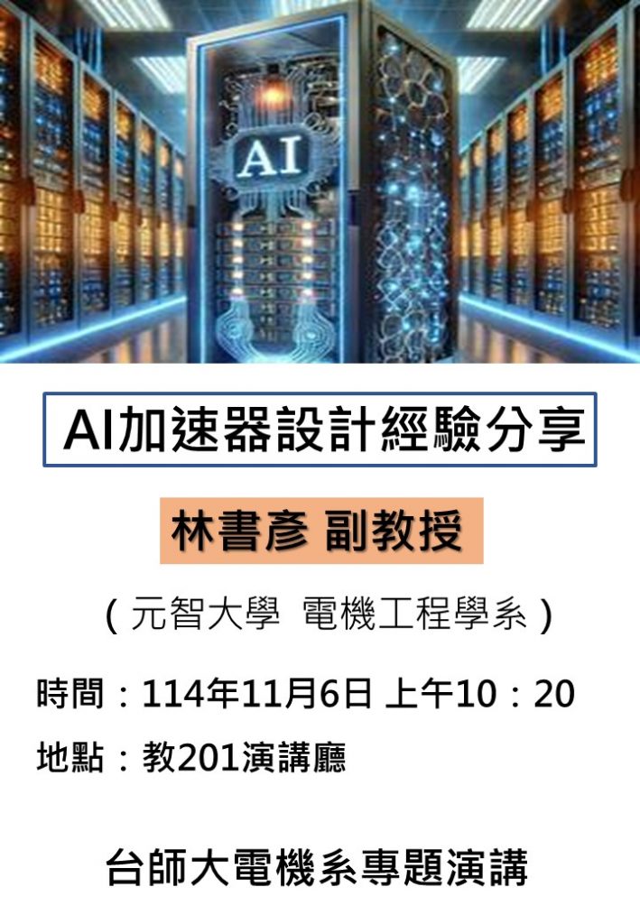 電機系專題演講:AI加速器設計經驗分享,講者:林書彥副教授,元智大學電機系,114/11/06(四)上午10:20,教201演講廳 Post author:ee Post published:2025-11-04