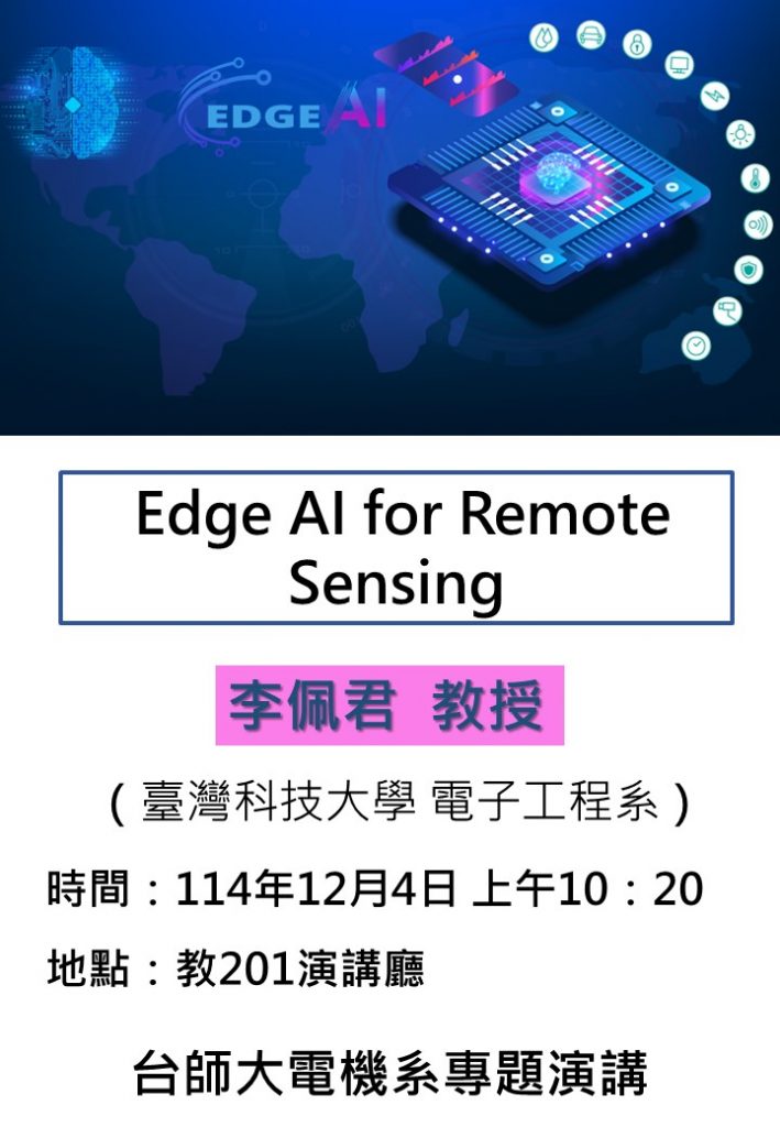 電機系專題演講:Edge AI for Remote Sensing,講者:李佩君教授,臺灣科技大學電子系,114/12/4(四)上午10:20,教201演講廳 Post author:ee Post published:2025-12-02